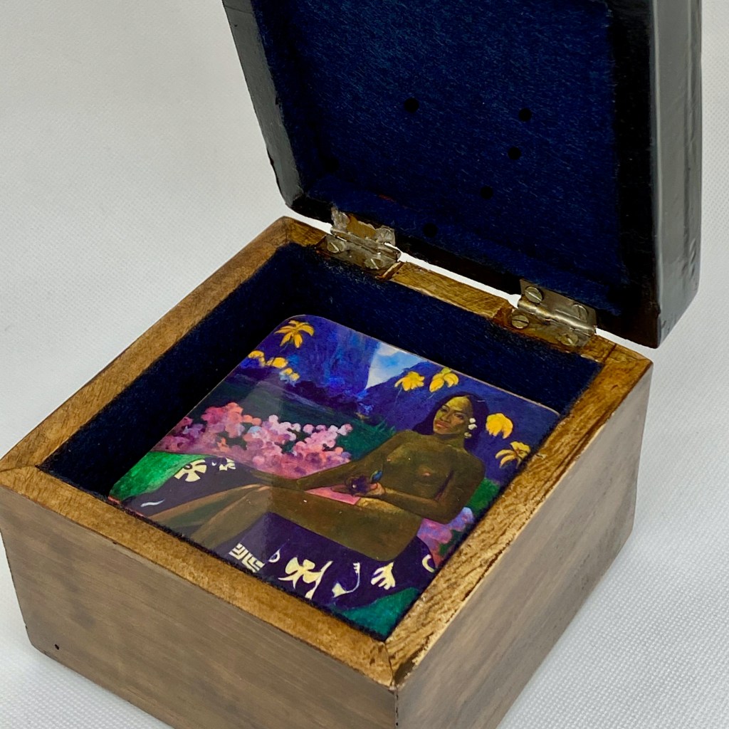 This began with a small wooden box I had purchased from Target years ago to hold coasters. It was pale wood with a painted orange lid. Over the years, water rings showed up on the lid (coasters inside; irony noted), so I decided to transform the lid. Easy enough. Maybe not.