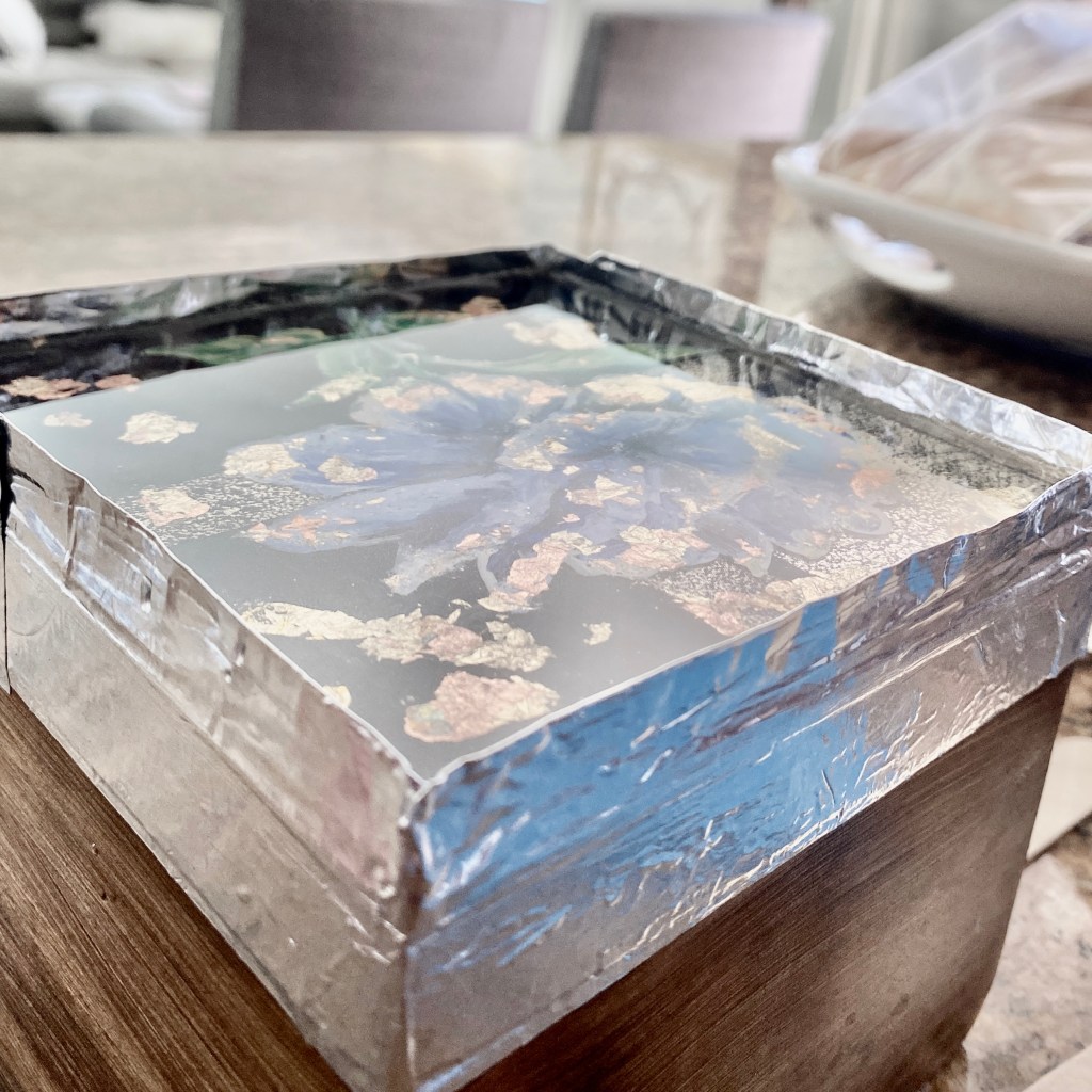 I took my sander and began leveling the resin and truing up the sides and corners of the lid. Next, I took out my acrylic paints and began painting a rose across the top in blue hues. I added some foil flecking to float across, and then did another pour; this time, a much thinner one.