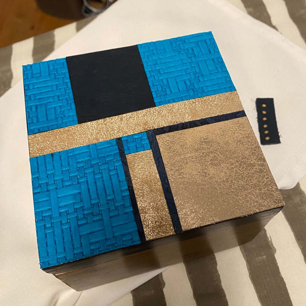 My first pass at the transformation involved using leather and suede to make a blocked pattern in blues and gold. I was happy with the look and glued them in place on the top of the lid and inside. Now, I just needed to seal the top. This leads me to the. . .