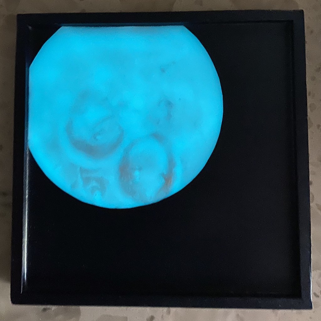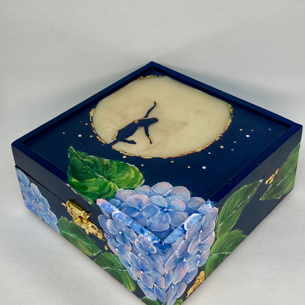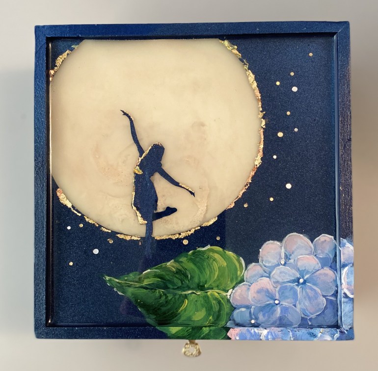 My favorite part of this project is the phosphorescent resin moon. I found this technique online through a YouTube tutorial by Moonkusser Art. I am always humbled by the generosity of other artists in sharing their craft.