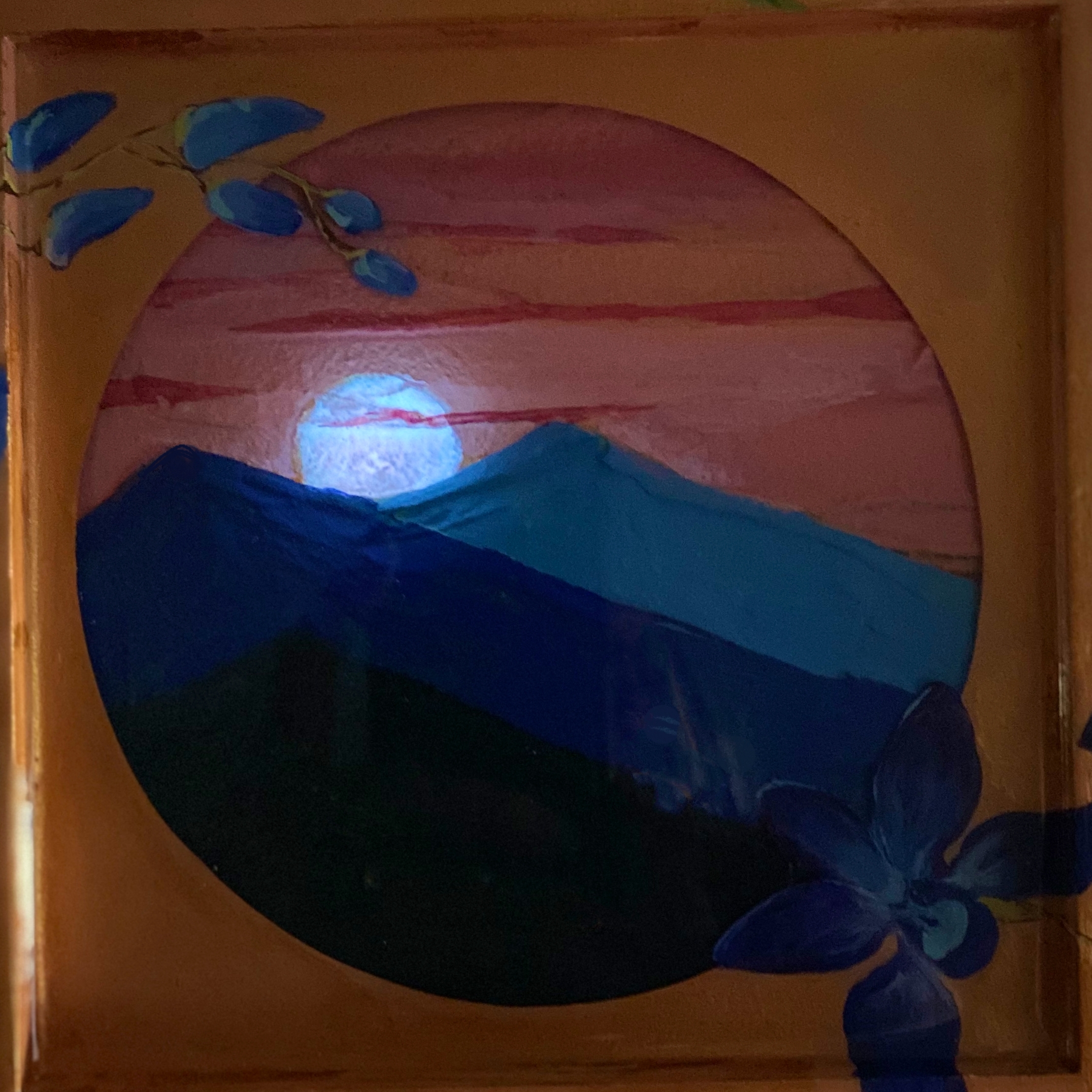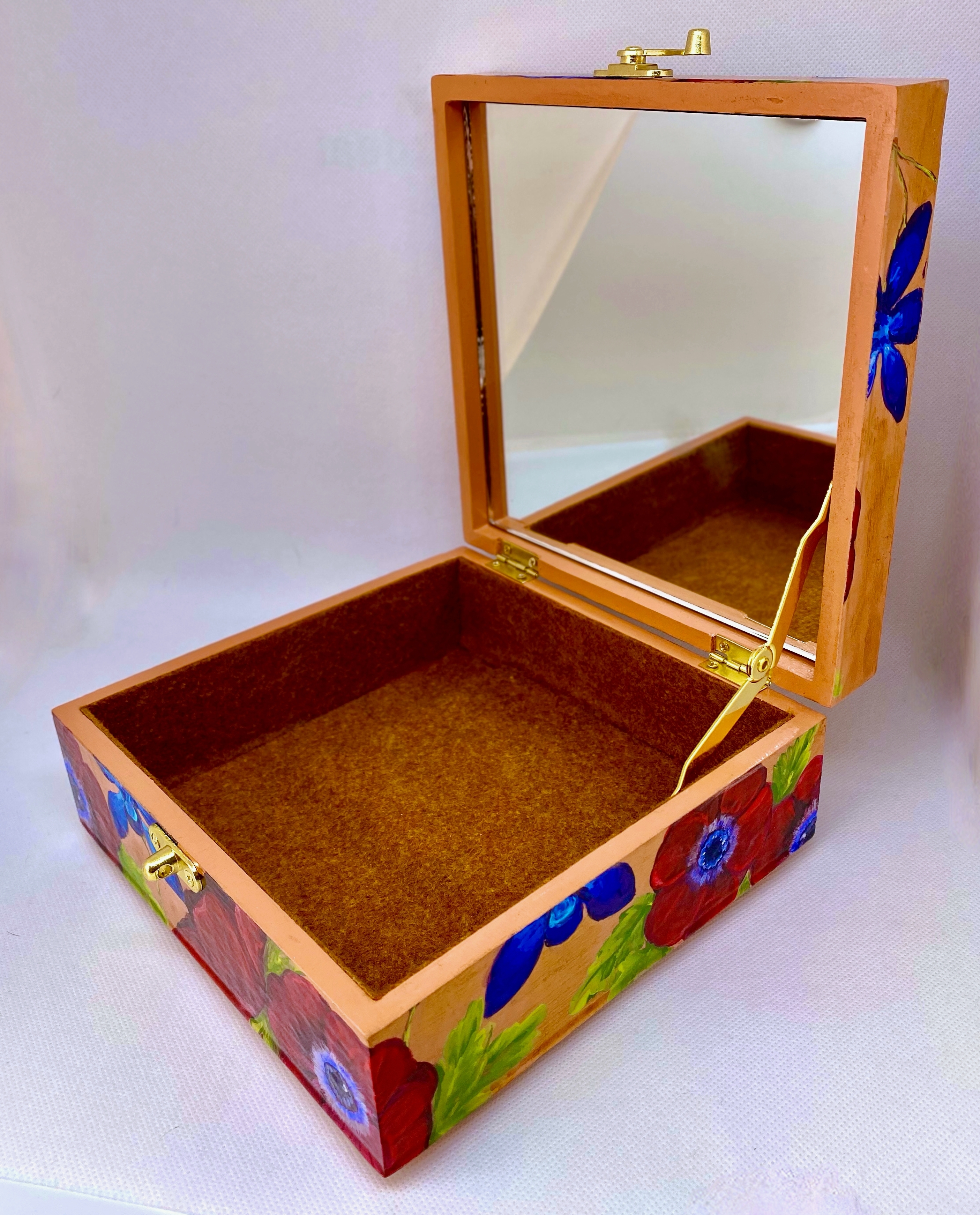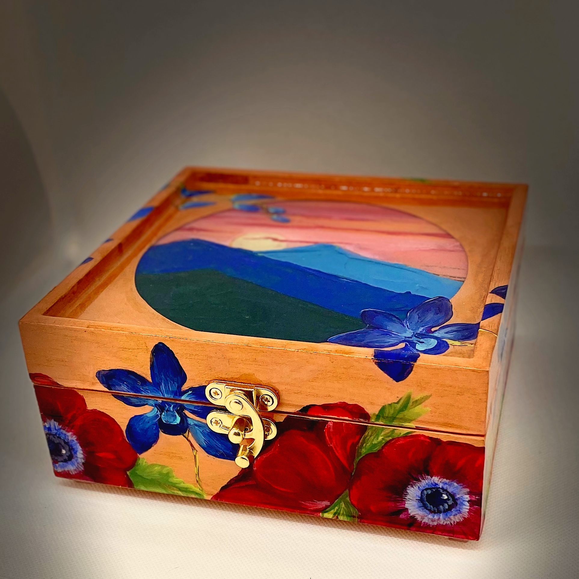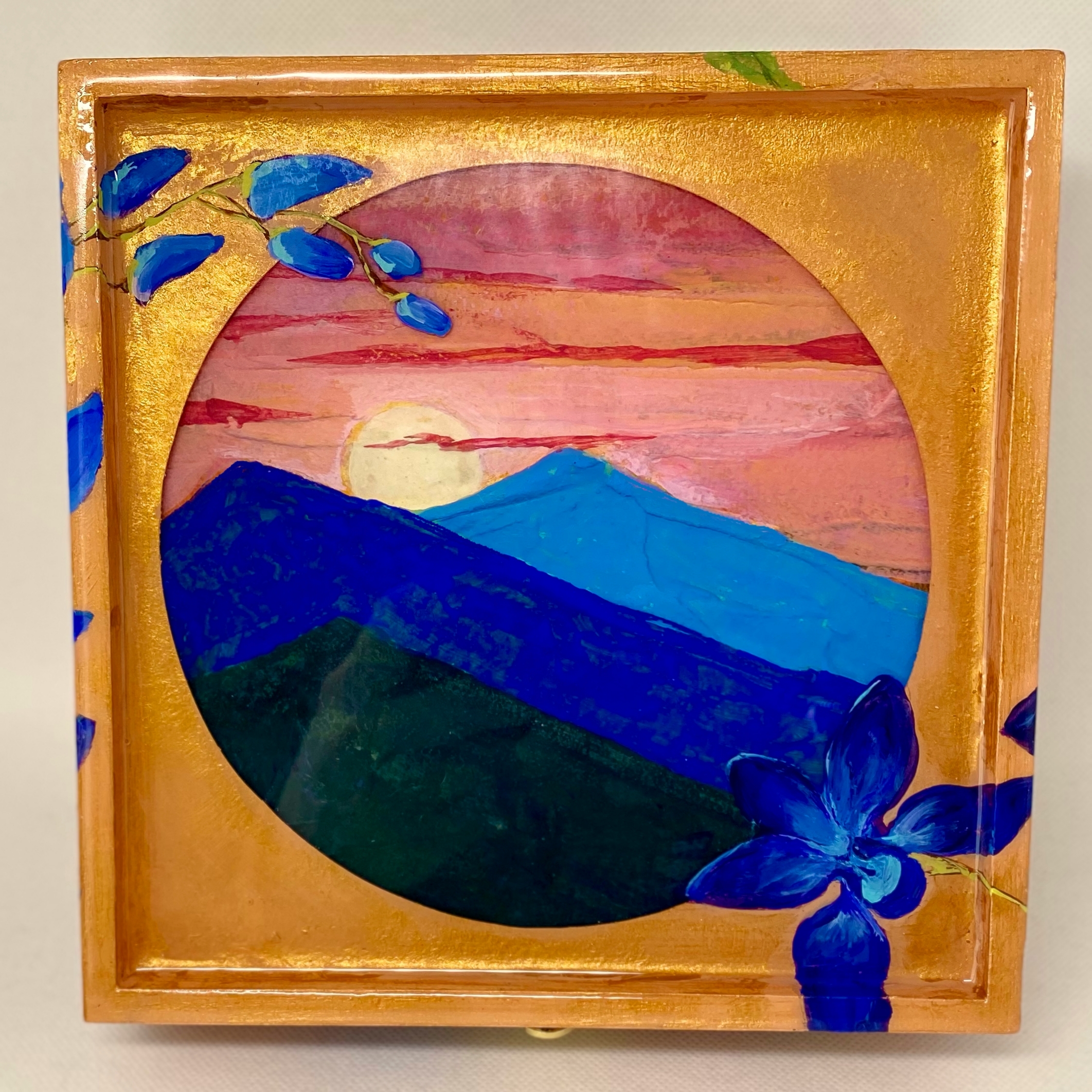 Special commission project: multi-layered lid top | 3-D Crete artist’s concrete, resin and acrylic: lid and box sides | acrylic and resin: interior | felt: dimensions | 7″ x 7″ x 3″